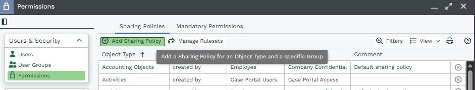 Save and close these Rulesets and now add a sharing Policy, by selecting Add Sharing Policy:
