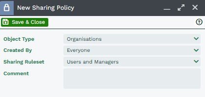 This means that any Organisation created by anyone will have the the sharing permissions of Users and Managers and depending on their User Group they will have different Permissions.