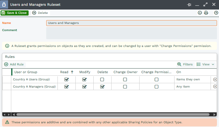 The example below will show how to change the Permissions of a User for Organisation Records. For this, you will need to have two rulesets, one for Managers and one for Users.