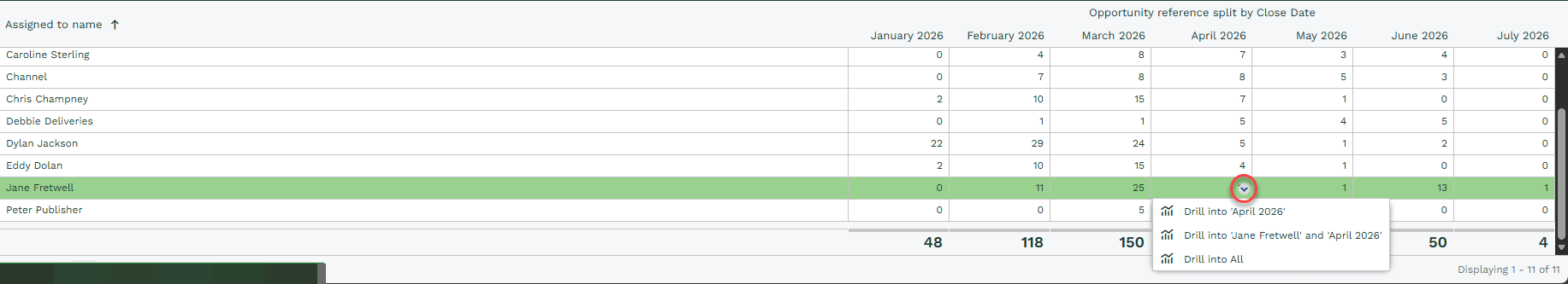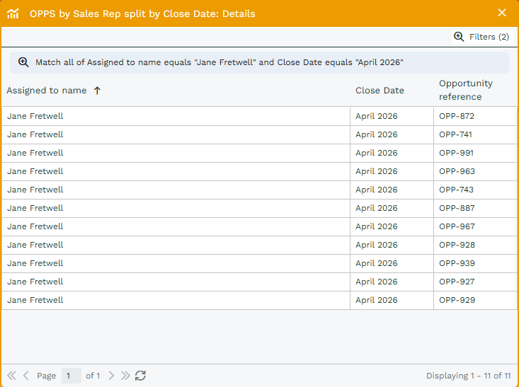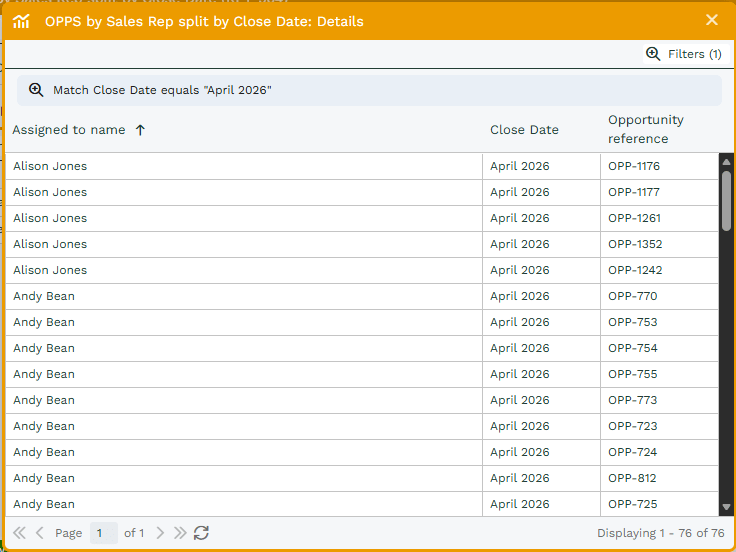 When you drill into ‘Dylan Jackson’ and Aug 22’ two filters are applied; the “Close Month” is equal to “August”, and the “Assigned to Name” equals “Dylan Jackson”.