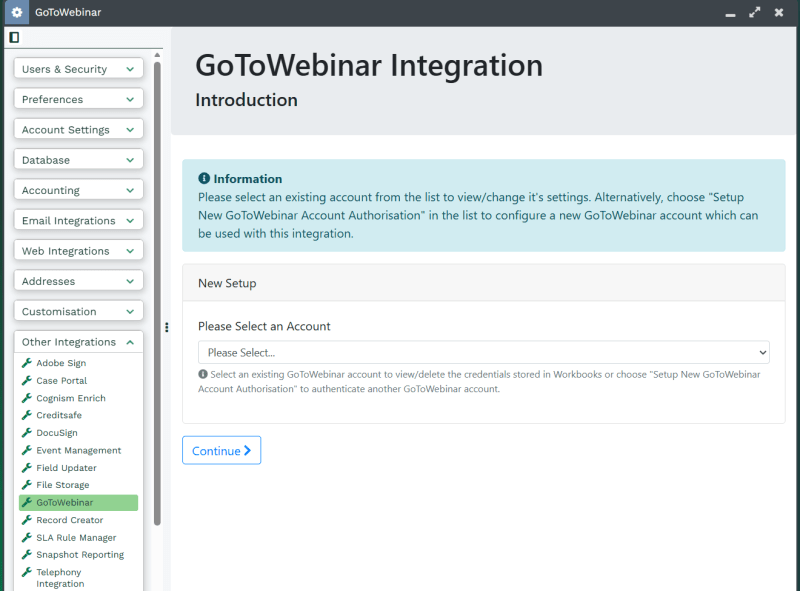 The GoToWebinar integration allows you to synchronise Webinars from more than one GoToWebinar account. Simply revisit the Plugin at any time and choose “Setup New GoToWebinar Account Authorisation” from the list. Clicking Continue will pop open a new window allowing you to login to another GoToWebinar account and complete the same steps as documented here.