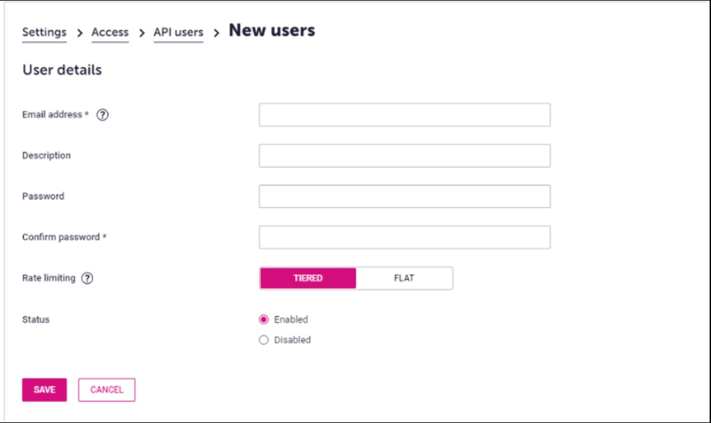 4. The username (email address) is automatically generated for you and must not be edited. You can add a description to differentiate between API users, which is useful if you have more than one.