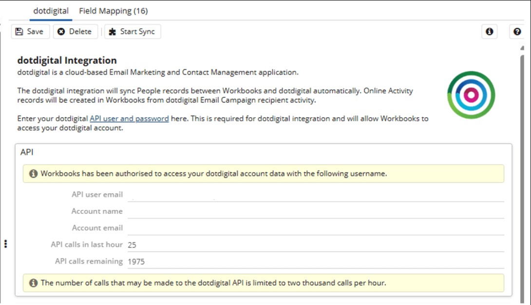 Once configured, click ‘Start Sync’ to automatically create a set of scheduled processes that facilitate communication between Workbooks and Dotdigital.